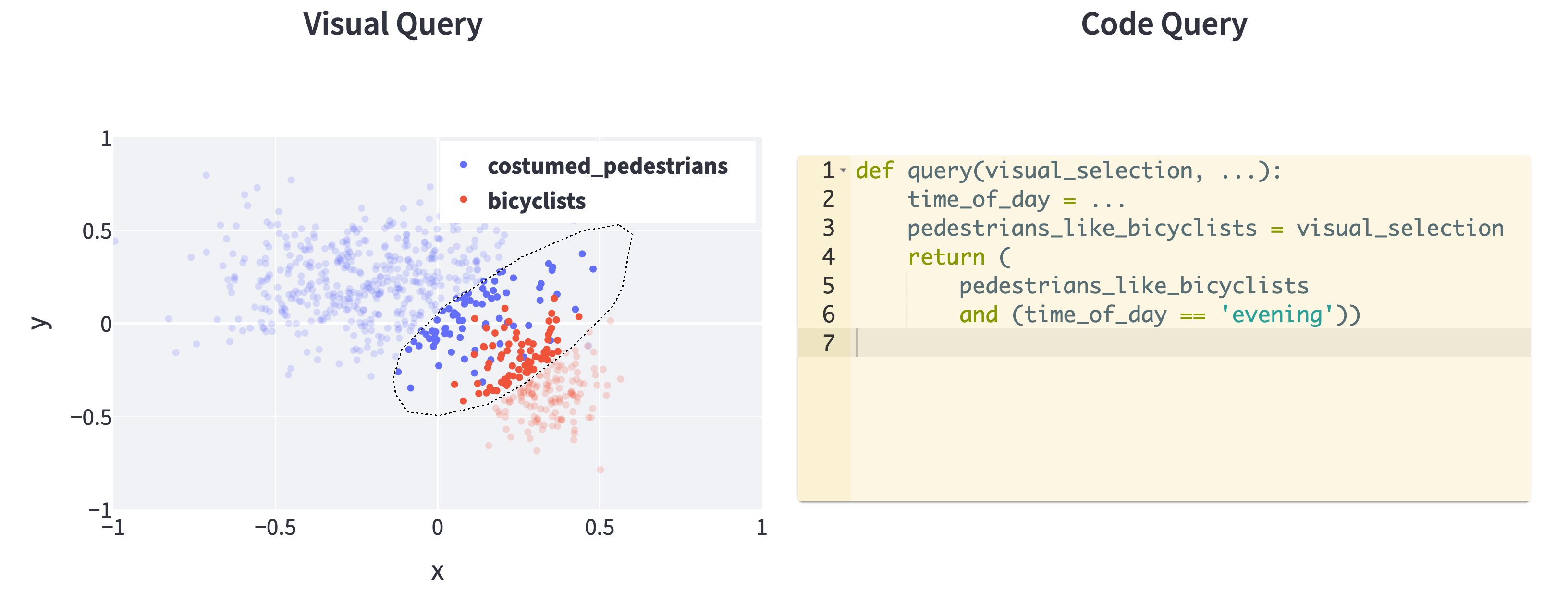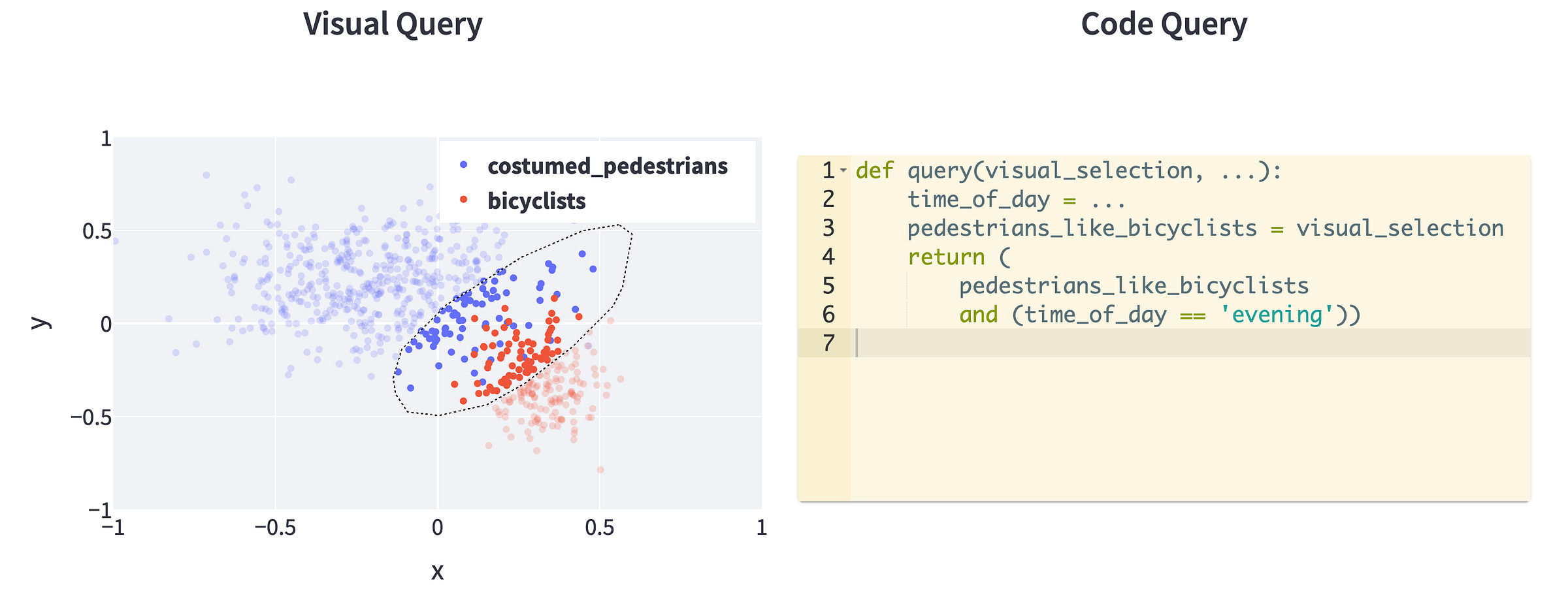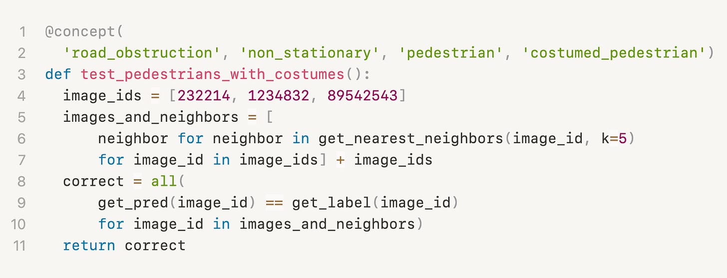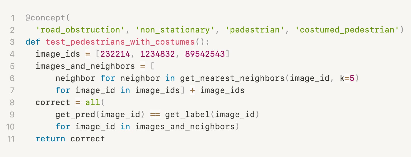 Now imagine a situation where “pedestrians” as a model’s target label may be suffering in performance. Pedestrians with costumes along with pedestrians with canes or walkers, scooter-riders, and other moving obstructions might be valuable concepts to use in a query, perhaps to understand why a pedestrian-detection model may be failing, or to surface unlabeled examples for further labeling. The first step to enabling this is recognizing that test cases, labeling, and error analysis are different facets of the same thing: building domain knowledge.