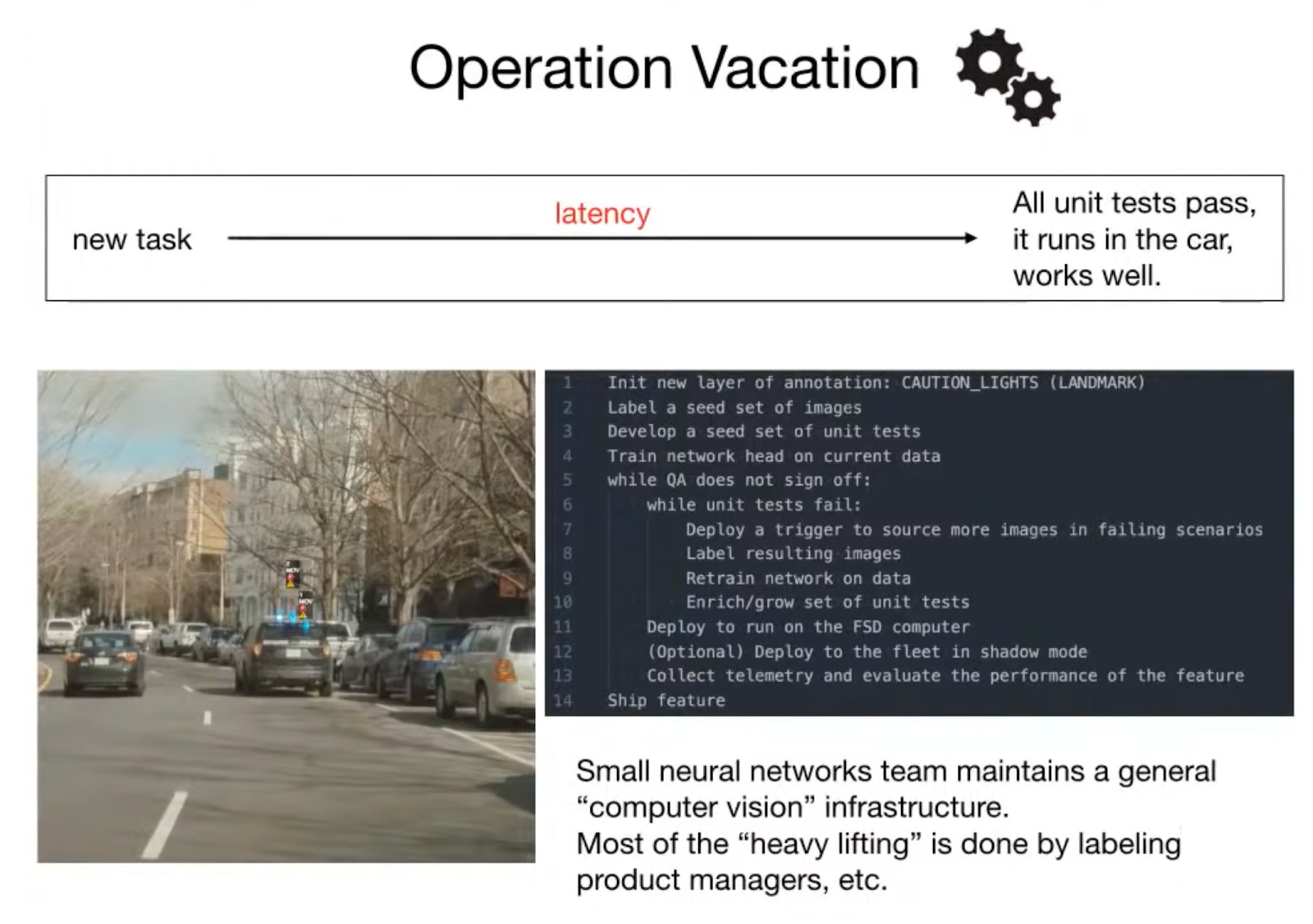 As Karpathy mentions, the north-star objective for his team is “Operation Vacation”—the idea that the self-driving tasks should improve even if the entire computer vision team were to go on vacation. Implementing that process means the platform is backed by a data model tying metadata around testing, labeling, and model prediction together.