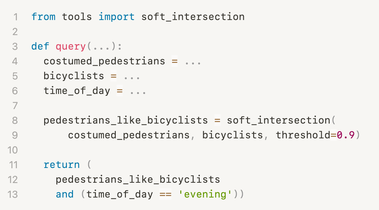 These gains compound when considering this process for large swathes of test scenarios. If our model was once sensitive to lighting conditions we may have a concept of “daylight” or “time of day”. We may also imagine, based on intuition, that detecting bicyclists is a helpful step towards detecting costumed pedestrians. We can then construct a query for useful pedestrian detection samples: